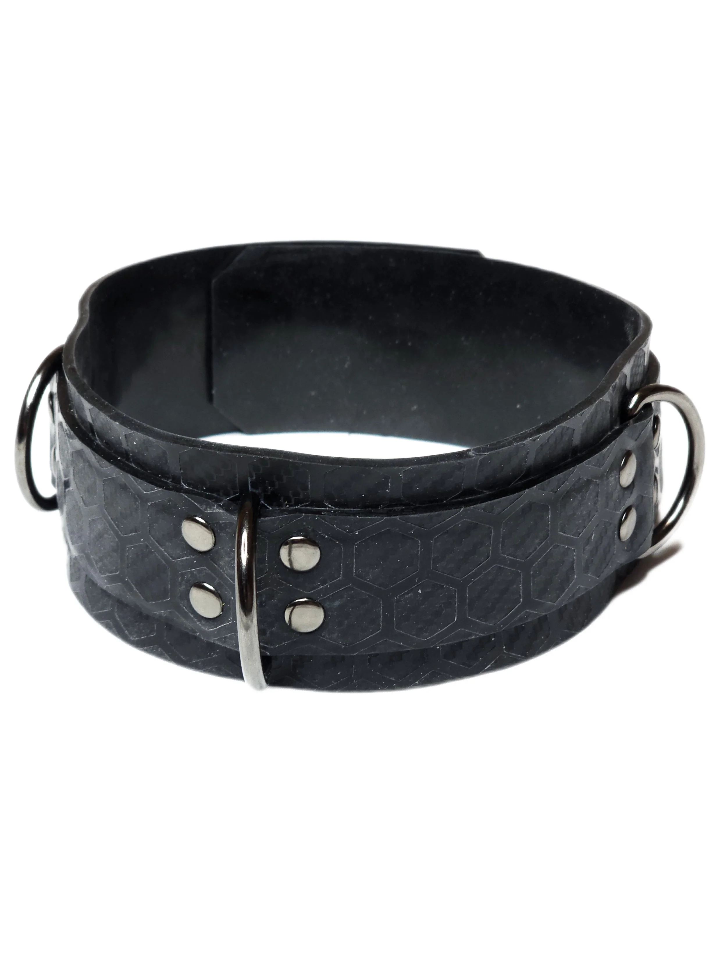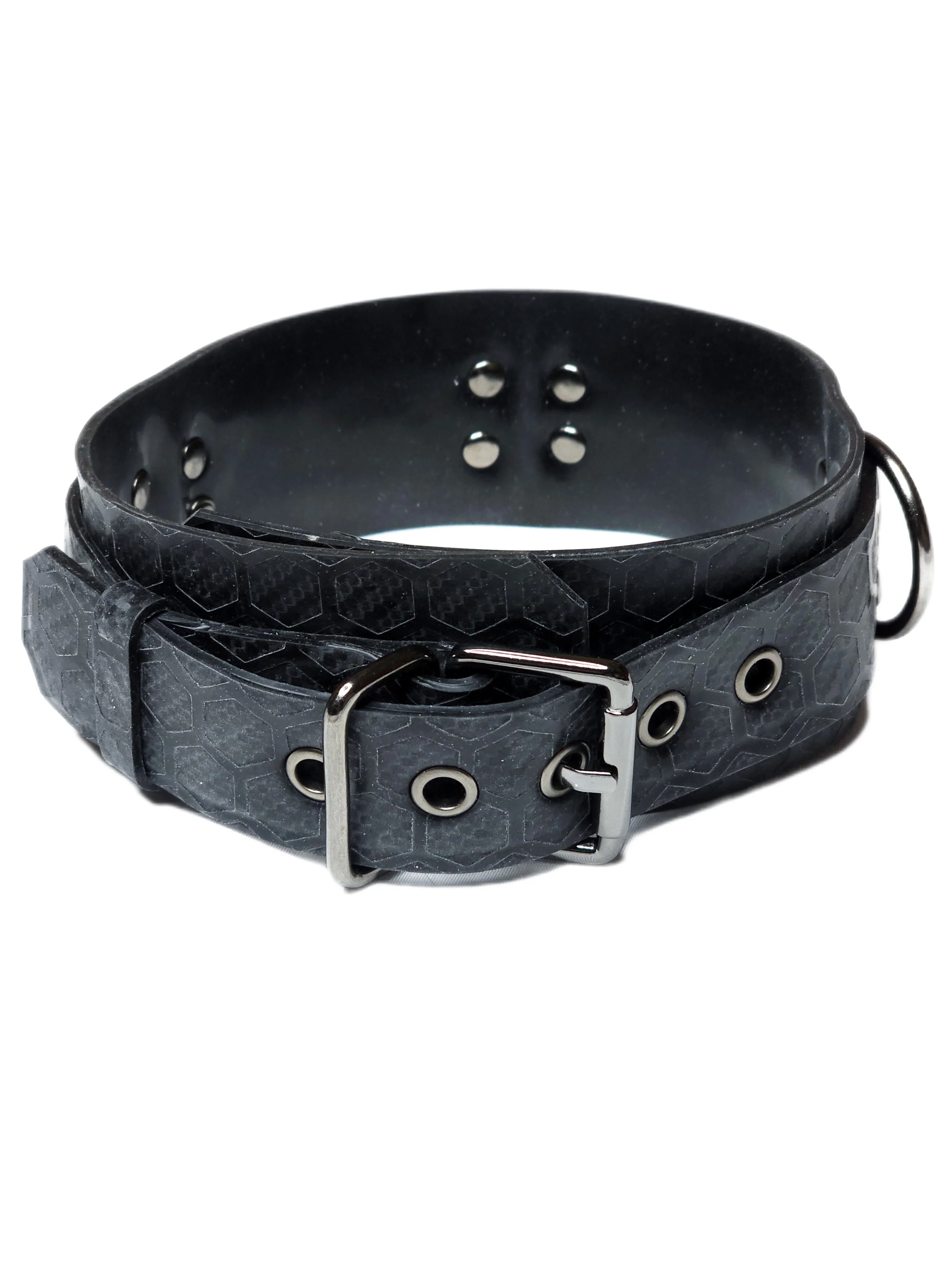 Hex patterned latex wrist cuffs, collar, bicep straps and chest harness, uniquely pops over any outfit with its touch worthy textured pattern distinct to Lulu Latex. Complete with gunmetal hardware. These statement pieces are perfect individually or as a completed set. Reinforced for play, pretty enough for a night out.